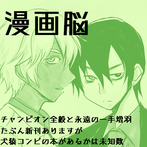 普段とくにお知らせのない当ブログですが今回はわりとぎゅうぎゅうです!-----------------------まずは、お知らせです。12/6ピクスクで週チャンオンラインオンリーやります!申し込み開始はまだ始まっておりませんが、イベントページと告知ツイッターを立ち上げておりますので詳細はリンク先でご確認願います!最近ピクスクをやたら気にしていたのはこれをやりたいがためでした。下見と勉強をしていました…。年明けくらいを考えていたんですが…2月にCCC開催が決まったとのことで(めでたい!)大急ぎで12月開催に向けて動き出したというのが実情でございます。わはは~…。というわけでイベントまではもう2カ月少々しかありませんが、興味を持たれた方はどうぞよろしくお願いいたします~!自分個人としてはチャンピオンでまた色々描きたい欲が出てきたので薄くても何か新刊が出せたらいいな~と思っております。-----------------------そんな勉強も兼ねて先日は「ラノベぷち!」に参加させていただきました。そして今度はオールジャンルイベントにお邪魔させていただきます。サークル参加費無料のイベントがまだまだ立っている状態なので習うより慣れろの勢いで…。今回の申し込みジャンルはチャンピオンです!といっても何かやるかといったら特に何も準備とかしてないです…せめてイベント告知はねじこみたいですね。-----------------------上でも少し触れましたが、2月にはCCC開催!とのことで当然のごとくこちらにも申し込みする予定です。リアルイベント、参加出来たら一年以上ぶりなので緊張する…というかよく考えたらチャンピオンジャンルでは一年どころじゃないな…相当久しぶりのイベントってことになるのでは?!こちらもまだ申し込みは開始されていないようなので続報待ちです。なんとか落ち着いてるといいですねころなか・・・。-----------------------近況というか最近の萌え。「家庭教師なずなさん」の犬猿コンビがメッチャ好きです・・・・・・・・・・。仲悪なのに息ぴったりだし考えれば考えるほどちょっとだめなやつですね(?)。試しに描いてみたものの自分の絵だとちょっと厳しい感じです。相変わらず成人男性が描けない…。(や、成人なのかよくわからないけど)犬猿なのか猿犬なのかはまだちょっと審議中ですね(?)。